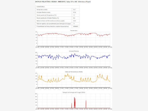 Durante este episódio do referido jornal, em nenhum momento o MIS RJ foi convidado a mostrar suas instalações ou a exercer seu direito de defesa contra esse ataque de desinformação, o que constitui um desserviço à sociedade. Em resposta, estamos divulgando publicamente o nosso relatório de agosto de 2024, referente ao setor específico da Biblioteca, localizada na sede da Lapa, que foi inspecionado oficialmente pela fiscal. Esse relatório é auditado pela empresa responsável pela implantação do nosso sistema de monitoramento, em operação desde 2022 em nossas principais instalações de reservas.