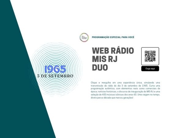 O querido leitor e internauta da Web Rádio MIS RJ está sendo presenteado também com a simulação de uma rádio igual àquela que tocava no dia da inauguração do MIS RJ, em 3 de setembro de 1965, é a WEB RÁDIO MIS DUO! São mais de 400 músicas dos anos 60, comerciais desse período, os chamados reclames, simulação de um locutor dessa época e o discurso, na íntegra, do Governador Carlos Lacerda! Essa programação especial estará disponível todos os dias até 2025, basta acessar https://web.mis.rj.gov.br/webradio/duo/