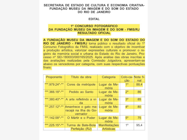 A lista completa dos vencedores e das fotografias selecionadas está disponível no site oficial da F.MIS e pode ser acessada pelo link: https://fmis.rj.gov.br/v1/concurso_fotografico_fmis/